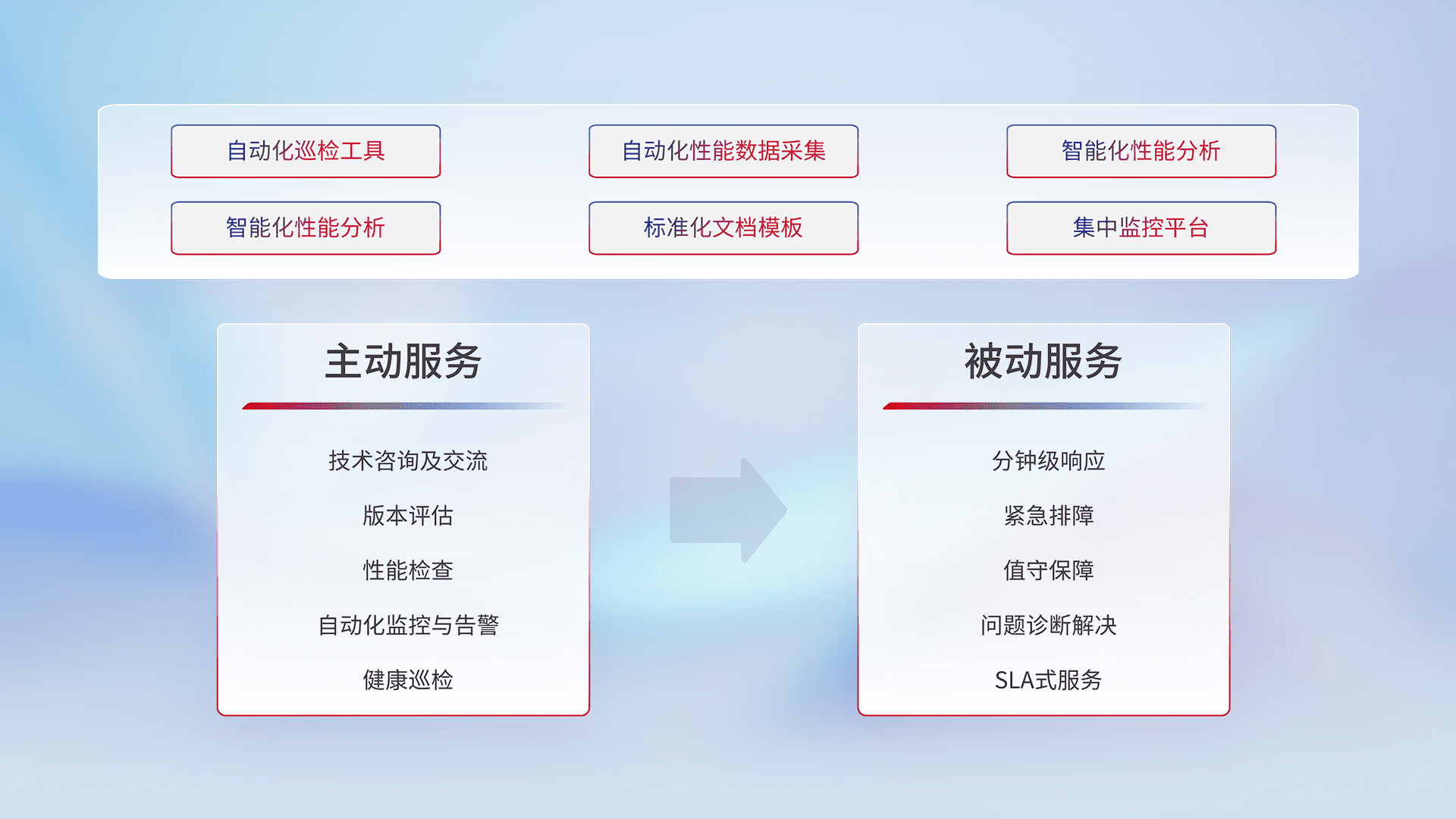 智能化工具和标准化文档,,,,保障服务质量,,,提供主动服务(包含技术咨询、、、、版本评估、、性能检查、、、、自动化监控与告警、、健康巡检)和被动服务包含(分钟级响应、、紧急排障、、、值守保障、、、、问题诊断解决、、SLA服务)。。